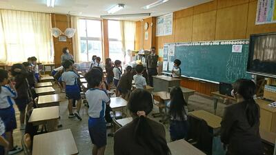 いつもは、ALT(英語の学習をお手伝いしてくださるネイティブスピーカーの方)は、英語の学習がある中・高学年の授業にしか入らないのですが、今日は低学年の授業に入ってもらいました。低学年の子どもたちは大喜びでした。