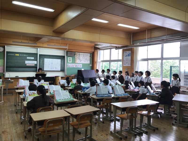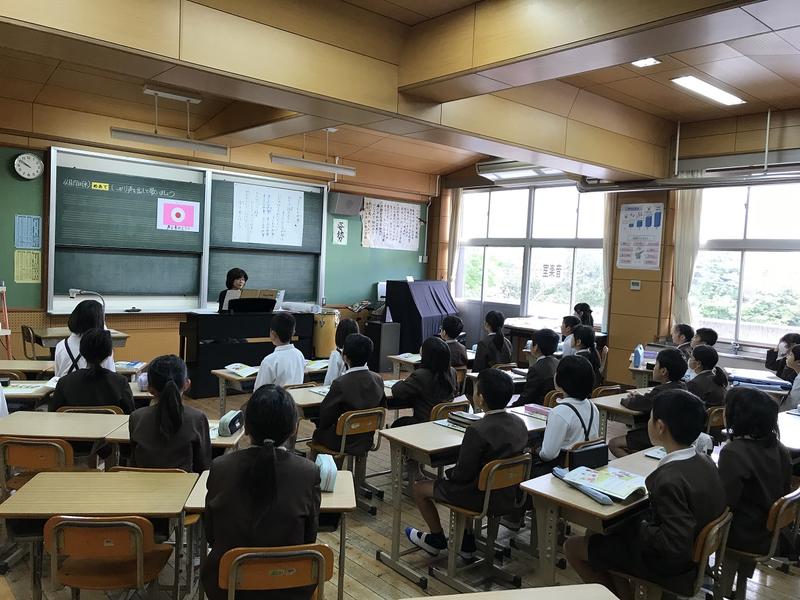 4年生の音楽授業の様子です。先生の伴奏にあわせて大きな歌声が響きました。