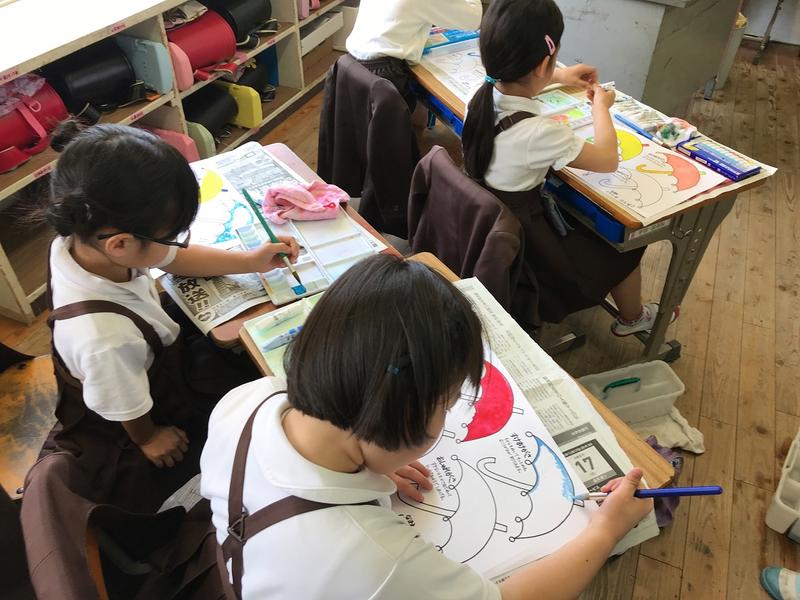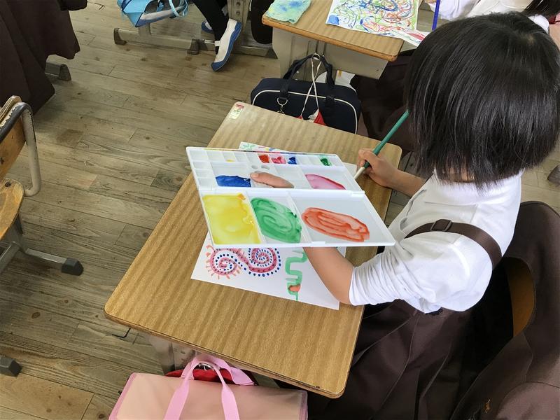 「絵の具と水のハーモニー」の学習で、水の量を調節しながらカラフルな作品を完成させていました。