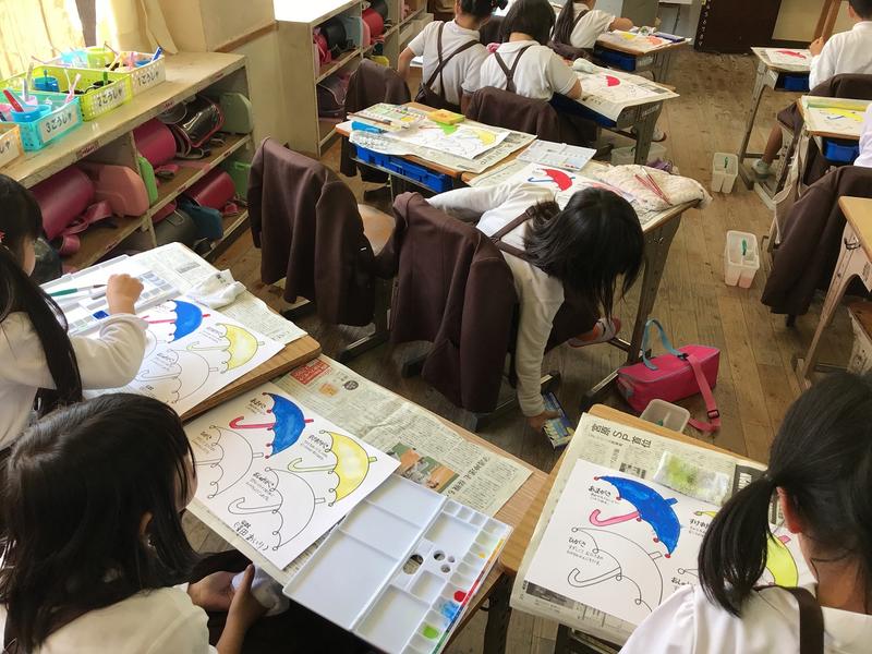 今日は朝から雨でした。傘をさしながらの登校で運動場も使えない状態でした。