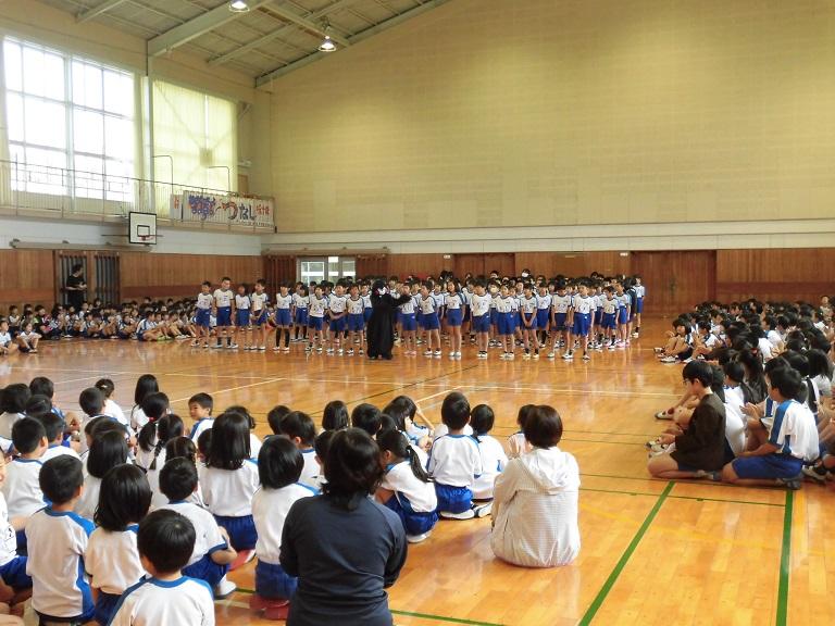 本日は歓迎会と歓迎遠足でした。歓迎会では各学年工夫した発表を披露し、1年生は大喜びでした。遠足では6年生が1年生の手を引き、がめさん公園へ行きました。絶好の遠足日和で大いに楽しむことができました。