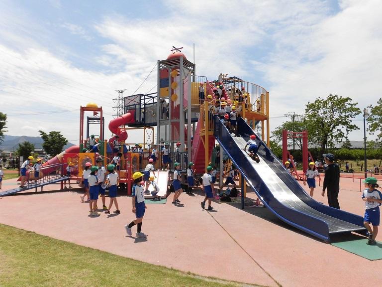 がめさん公園には広い芝生と大きな遊具があり、青空の下で思いっきり遊びました。