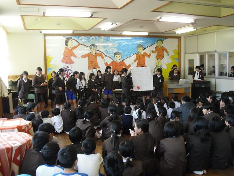 5・6年生一緒に校歌を歌いました。2学年の子どもたちの歌声が、体育館いっぱいに響きました。
