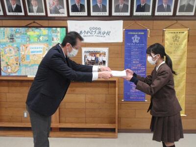 今日は、人権作品に入賞した子どもたちの表彰を、校長室で行いました。
