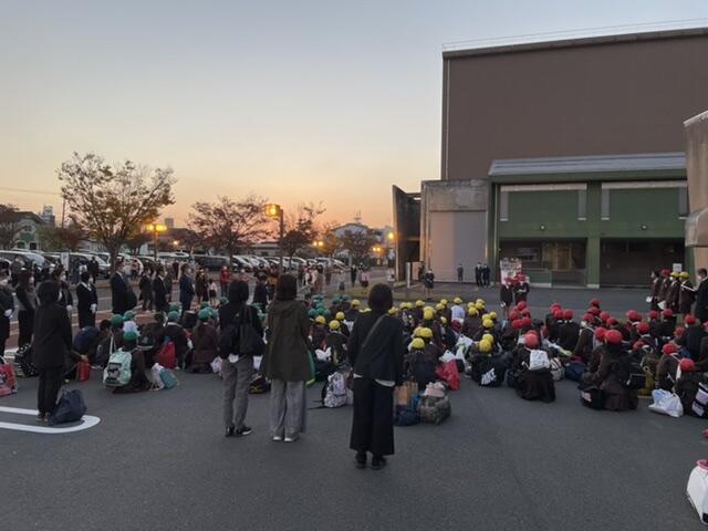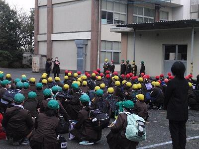 今日は、シェイクアウト訓練の後に火災が起きた設定で、避難訓練を行いました。