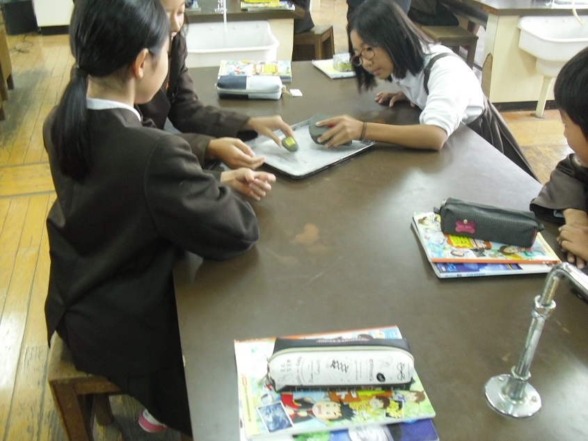 上流と下流の石を比べています。大きさや触った感覚など、細かい観察がよくできていました。二つの石は、授業者の先生が、実際に川に行って取ってこられたものです。