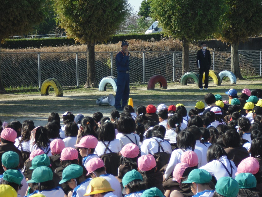 約800人の子どもたちが、一斉に避難することは大変なことです。しかし、本校の子どもたちは「おはしも」の(お:おさない は:走らない し:しゃべらない も:戻らない)約束をきちんと守り避難することができたので、消防士さんからほめてもらいました。