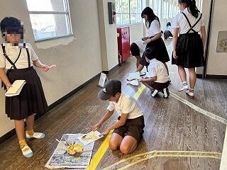 「栽培環境美化委員会」の皆さんが学校の廊下の中央線をペンキで塗っていました。