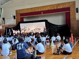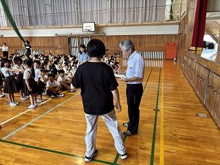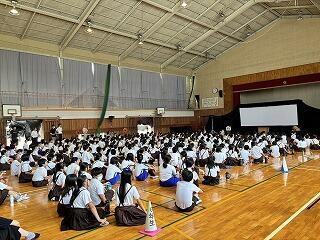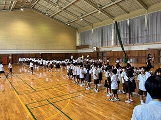 気温が非常に高いために、熱中症対策として体育館に集まらず、オンラインで実施しました。