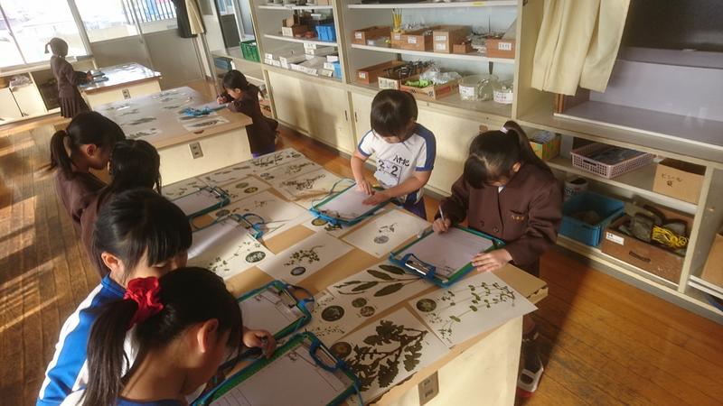 昨日から熊本県博物館ネットワークセンター所蔵物が理科室前に展示してあります。主な展示物は樹脂封入標本、パウチシート、布製パネルです。子どもたちはじっくり見て、シートにまとめていました。