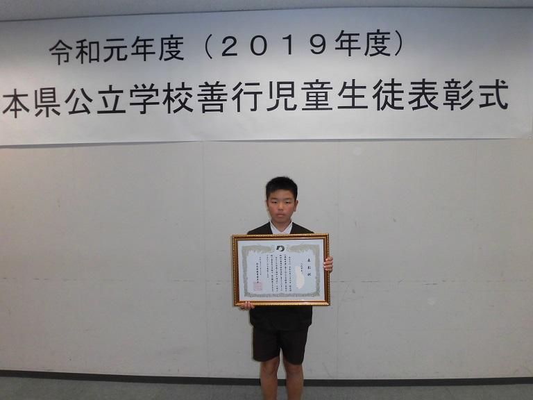 令和元年度熊本県公立学校善行児童生徒表彰式が熊本県庁で開催されました。本校から6年生が県内代表者として表彰を受けました。校長先生が発行される学校便り「やちわっ子」第6号にてくわしく紹介してあります。「校区内の横断歩道に座り込んだ高齢者の方に気付き、救助の要請や救助活動に当たった。」ことでの表彰でした。校長先生が掲げられておられる学校教育目標の1番目が「思いやり」です。さすが6年生。本当におめでとうございました。
