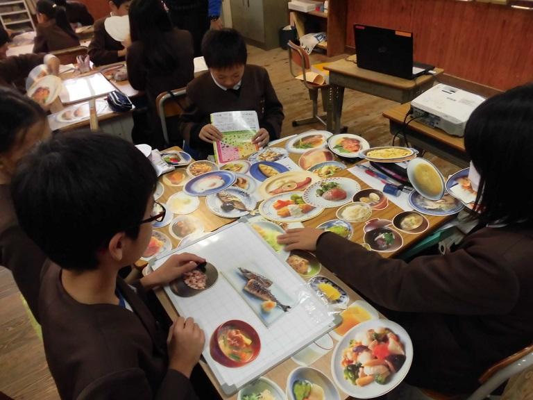 本日は、中学校の先生が本校で授業を行う「相互乗り入れ授業」がありました。6年生家庭科「栄養・バランスのよい献立を考えよう」の授業でした。子どもたちは班で話し合いながら1食分の献立を考えていきました。