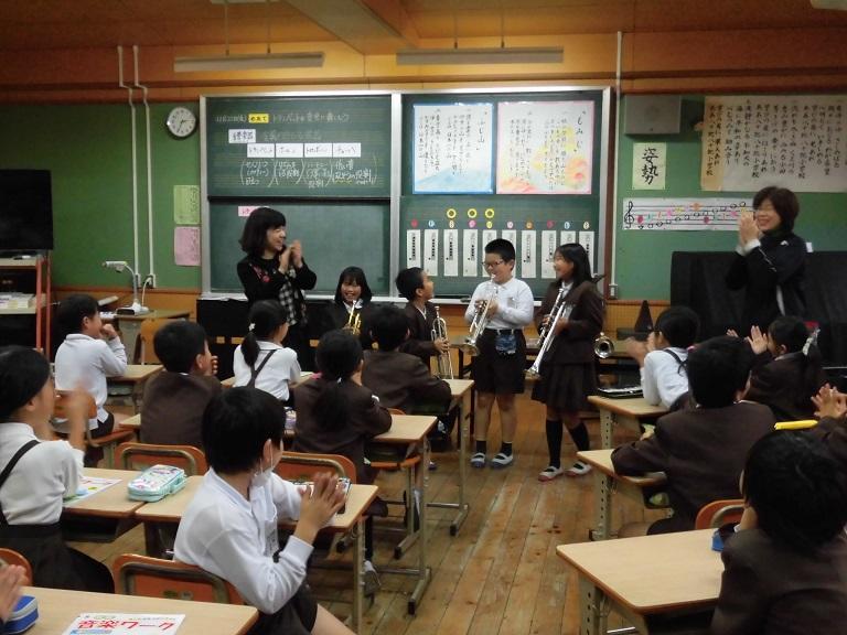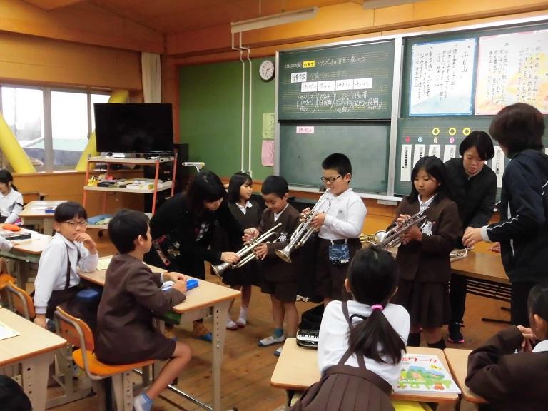 3年生の音楽の授業では、吹奏楽クラブの先生においでいただきました。「トランペットの音色に親しもう」という学習で、子どもたちの目の前でトランペットを演奏していただきました。音楽室いっぱいに素敵な音色が広がりました。