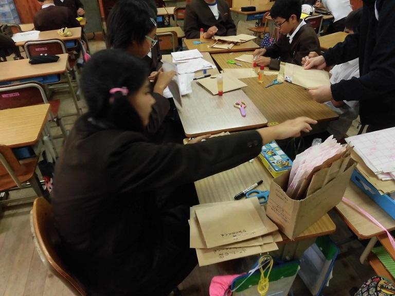 鉛筆の削りかすや黒板チョークの粉入れの袋を作っていました。