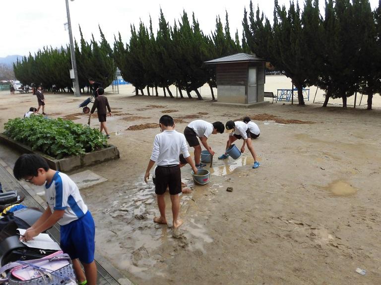 前庭の水たまりに砂を入れ、ならしてくれました。