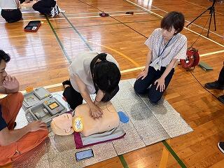 職員が消防署の方に心肺蘇生法を指導してもらっています。