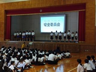 それぞれの委員会から「元気のよい あいさつができて きれいながっこうにしよう」「ろうかは走らないようにしよう。」など呼びかけました。