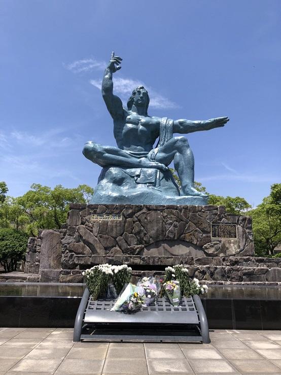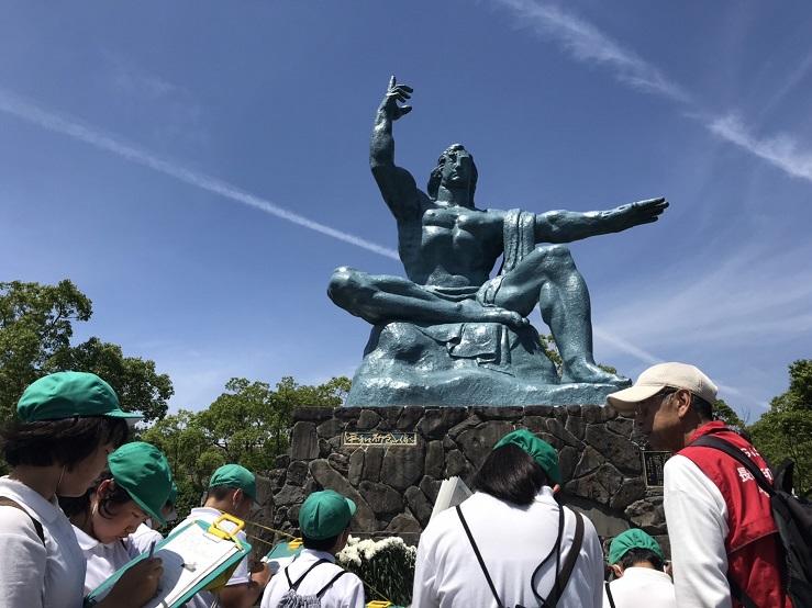 晴天の中、平和祈念像の前で平和集会を行いました。堂々とした姿で誓いの言葉を伝え、素晴らしい歌声で平和を願う歌「折り鶴」を歌うことができました。現在、班ごとに分かれて現地ガイドの方々の案内でフィールドワークを実施しています。現地で学ぶことの意義をかみしめ、実際に見ることで戦争の悲惨さを感じてほしいと思います。
