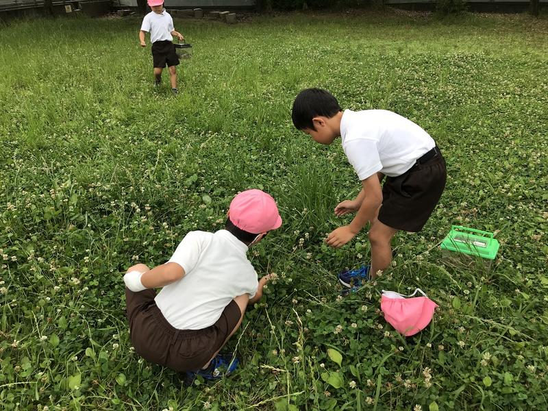 運動場の隅で虫取りに夢中になる子どもたちです。