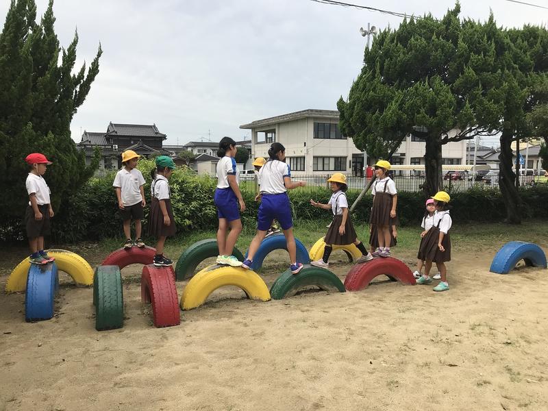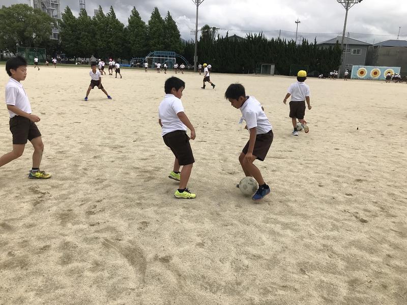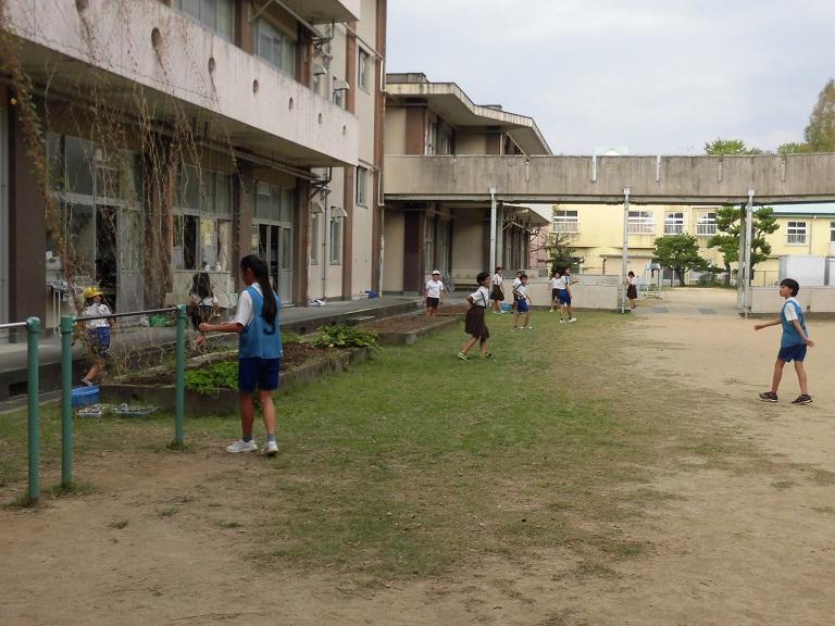 先日の雨天から一転し、本日は晴天に恵まれ、子どもたちにとって絶好の遊び日和です。昼休みの運動場や中庭は大賑わいでした。