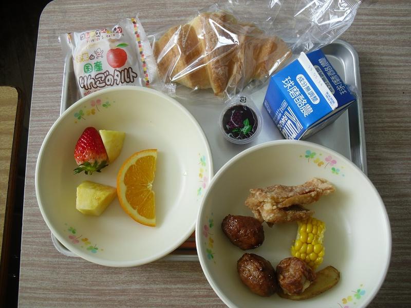 配膳すると写真のようになります。おかずだけでなく、デザートやフルーツもたくさんありました。先生方の中には、「今日だけ6年部に入ろうかな?」という声も聞こえてきました。