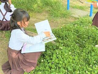 今日はよい天気の中、3年生が校庭の生き物を観察していました。