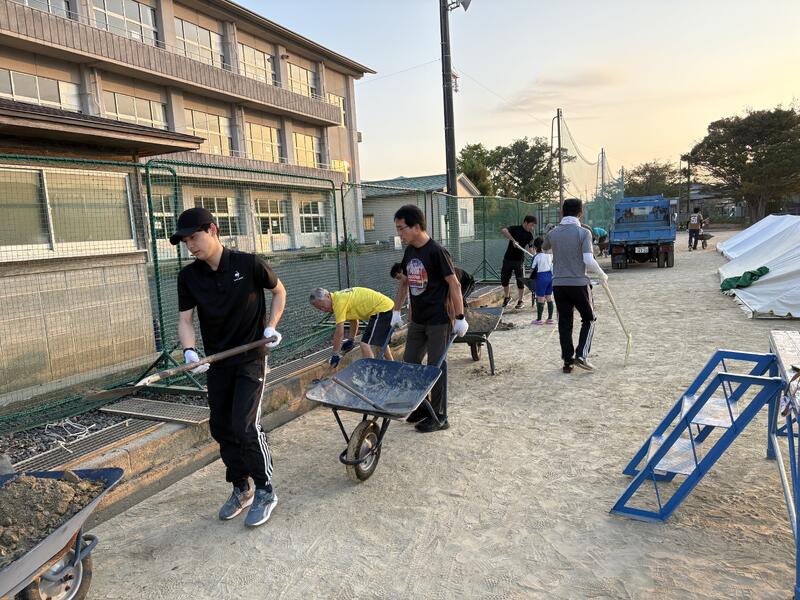 1~4年生は運動場の石拾いや掃除、5~6年生は会場設営をがんばりました。
