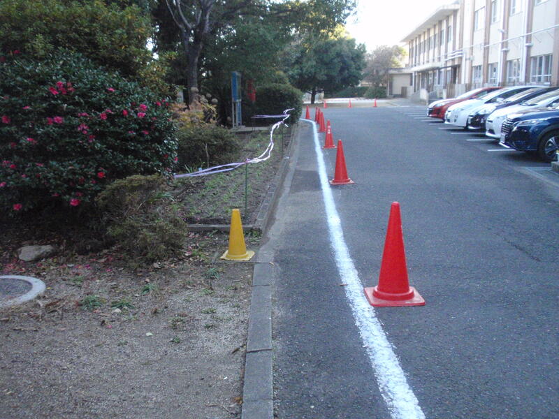校門からの通路は、人と自動車の両方が通行しています。これまで危なくないように、歩行者と自動車を分ける白線が引いてあったのですが、長い年月の間に薄くなっていました。そこで、冬休みの朝の誰もいない寒い時間帯に、白のラッカースプレー?を使ってラインを引いてもらいました。大変ありがとうございました!