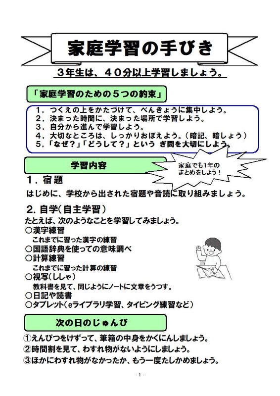 ①ドリル集 各教科3ページずつの計15ページ進める。(社会は終わっているので理科を6ページ進めてください。)