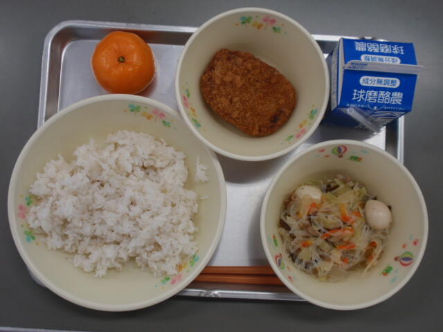今日の給食は、「味の旅 埼玉」というテーマで、糧飯(かてめし)と煮ぼうとう、ゼリーフライ、一食ソース、牛乳でした。煮ぼうとうは、熊本でいうところのだご汁のようなものですが、「だご」ではなく平たいきしめんのようなものが代わりに入っていました。かてめしは、まぜめしのようなものでした。ゼリーフライはゼリーが入っているわけではなく、中身はおからでした。形が小判(銭)に似ているからゼニフライとなり、それがなまってゼリーフライとなったそうです。(諸説あり?)