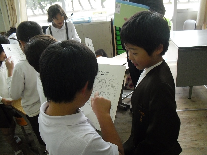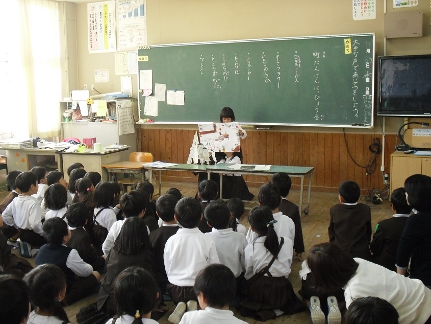 5時間目に、2年生の1クラスで先月行った町探検の発表会がありました。聞き手には、1年生の1クラスが招待されていました。