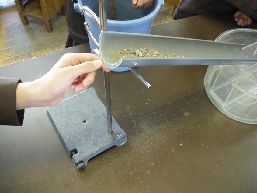 子どもたちは、この後学習シートにスケッチをしたり、気付きを書いたりしました。子どもたちの気付きには、粒が大きいものが下に堆積することを記述していました。