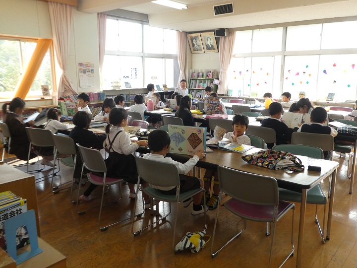 今日の5時間目、図書室の様子です。1年生が落ち着いて本を読んでいます。本校では子どもたちが本に親しむために、すべての学級が1時間ずつ図書室を利用できるように配当しています。そのために、図書室の利用が多く、本の借り換えを積極的に行っています。