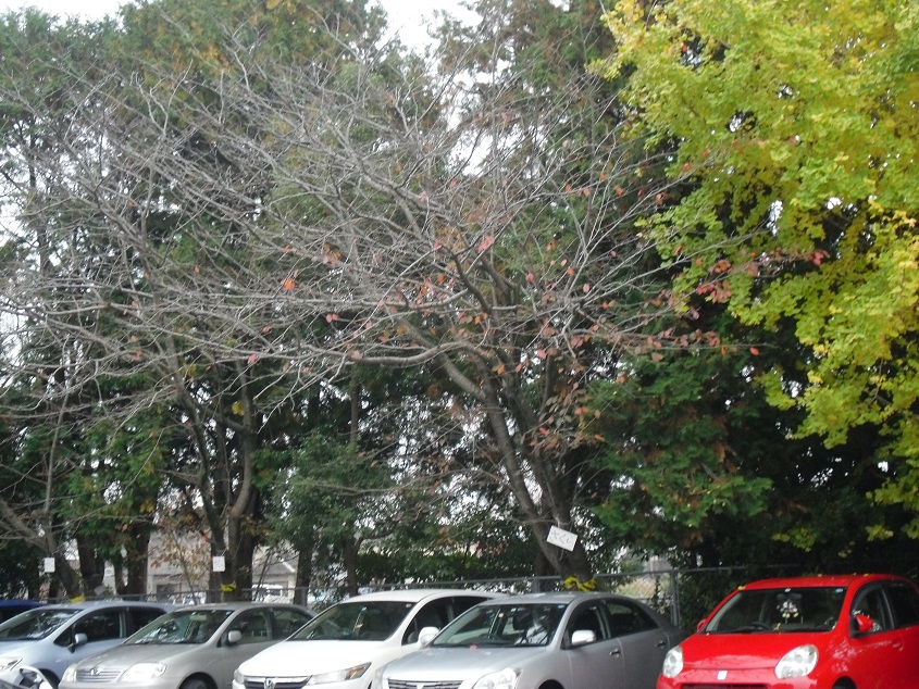 駐車場の様子です。これだけ落葉しているのに、駐車場には落ち葉がありません。これには、わけがあります。毎朝、用務の先生がブロアー(大きなドライヤーのようなもの)を使って、掃除をしてくださっているからです。職員の車が入る前に、いつもきれいになっています。本当に、ありがたいです。