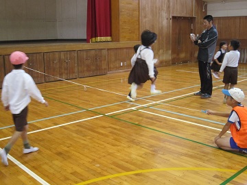 運動場では他に「ハードル遊び」「タイヤ跳び」「的当て」「登り棒」をサーキット形式で行います。