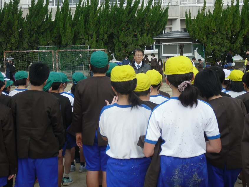 閉会式の中での、校長先生のお話です。校長先生はよく「昨日の自分に負けない」と言われます。お話しでは、雨の中でも全員がよくがんばって走りきったことや6年生になるための強い心の準備ができていることを賞賛されました。
