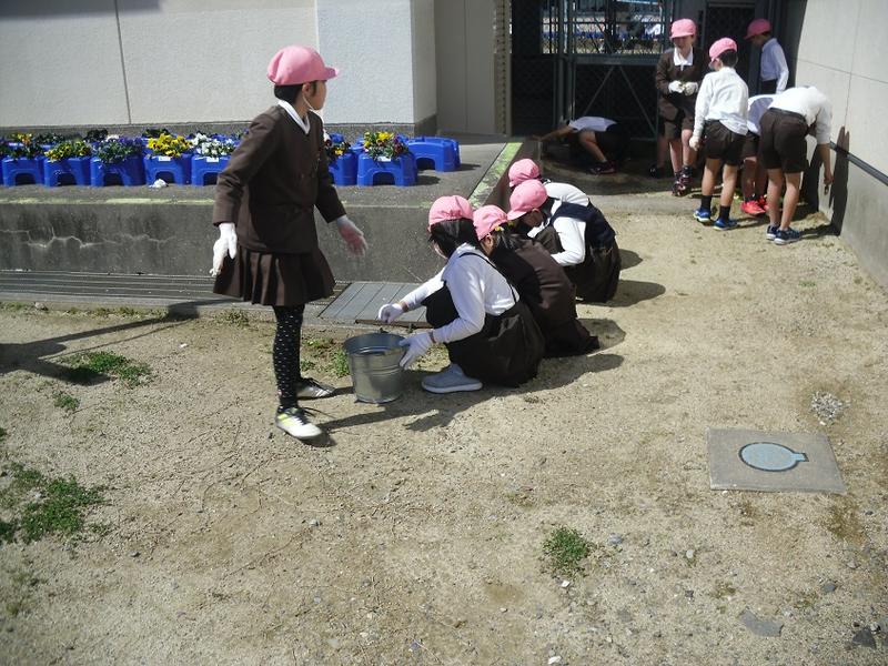 3年生は、2年生教室前の花壇の周りの草取りをしました。