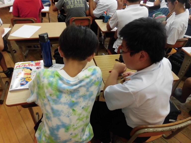 閉講式で校長先生から「これからの長い夏休み、今日教えてもらったことを生かして、自分でしっかり頑張って下さい。中学生の皆さん2日間、忙しい中に来てくれてありがとうございました。教えるという経験を通してやりがいなど学んでくれたと思います。」と話されました。この2日間で、参加した子どもたちが算数に、これまで以上に自信をもって取り組んでいってくれればと思います。
