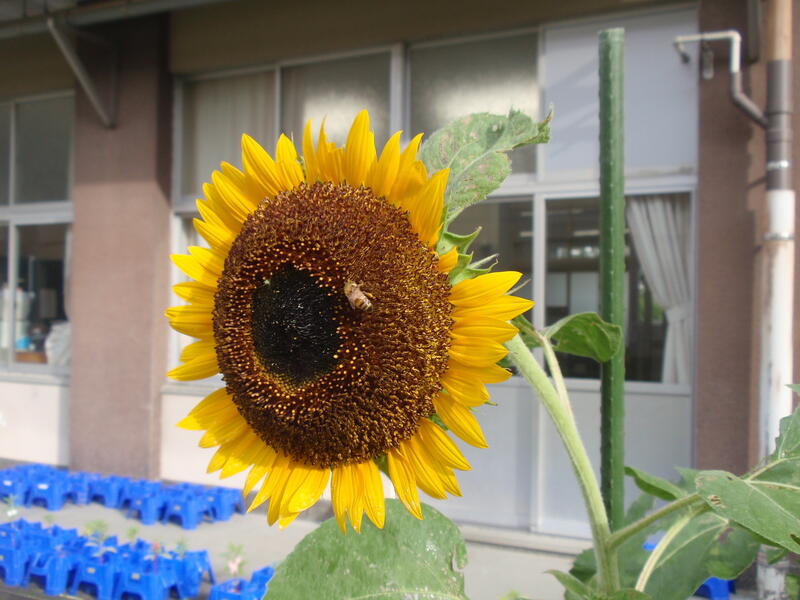 ヒマワリは、大きく育ち1年生の背丈よりもはるかに高そうです。