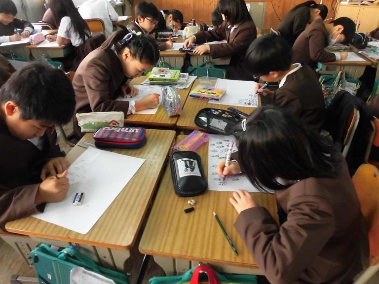 【4年生:図工】「友だちたくさん集まって」の学習。画用紙いっぱいに思い描いた友だちを描き上げていました。