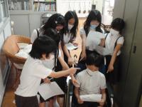 4年生は、体が不自由な人にもやさしいまちづくりについて学習しています。子どもたちは保健室にある車いすを見つけると、さっそく乗ってみたり車いすの工夫を見つけたりするなど、興味を持って観察していました。足に重傷を負ったりして歩くのが難しい人にもやさしい移動手段や建物のつくりについて考えてくれたようです。