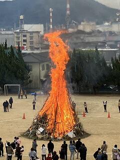 雪が降るほど寒かったのですが、火がつくと周りがとても暖かくなりました。竹の「ポンッ」と爆ぜる音がとても迫力がありました。