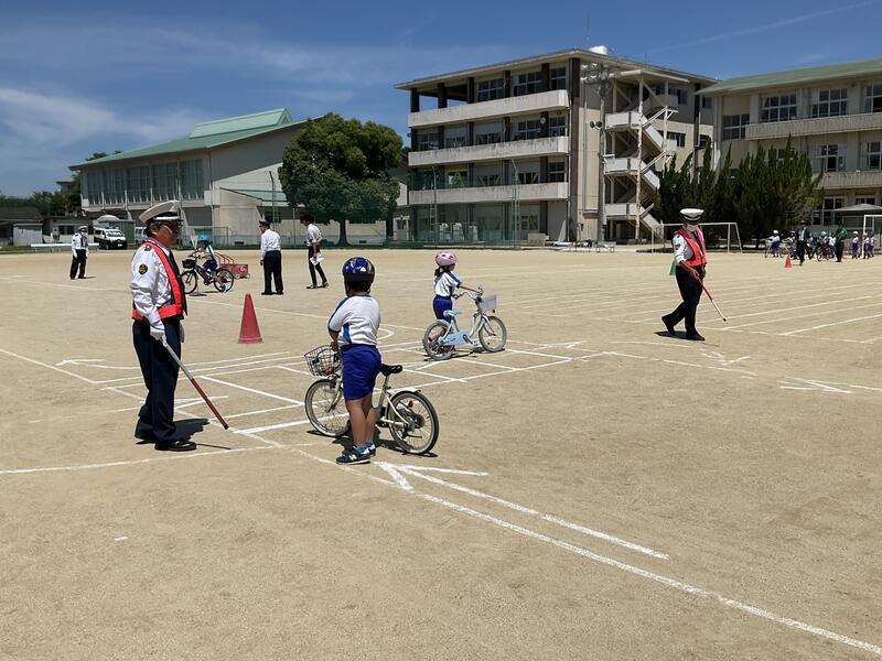 その後、運動場で実技を行いました。実際に自転車に乗りながら、