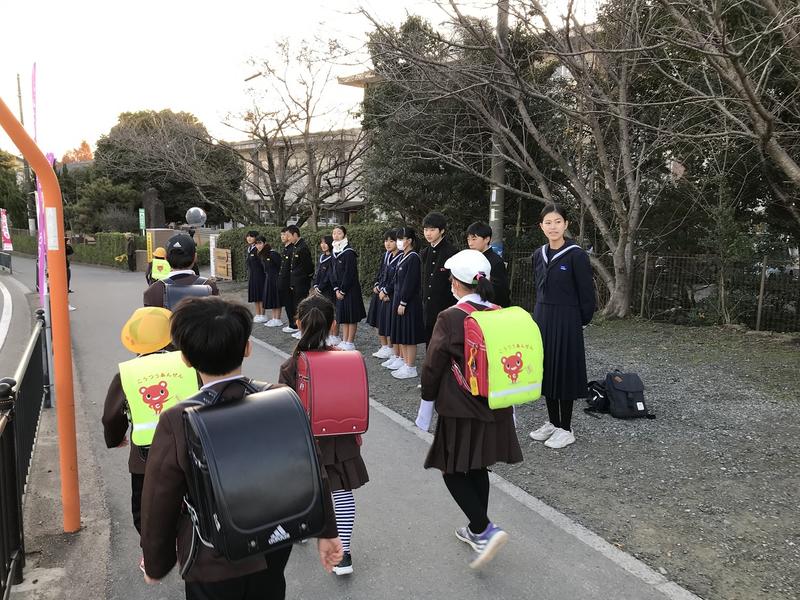「元気なあいさつ 笑顔いっぱい やちわっ子」小学生も中学生も素敵な笑顔であいさつをかわしていました。