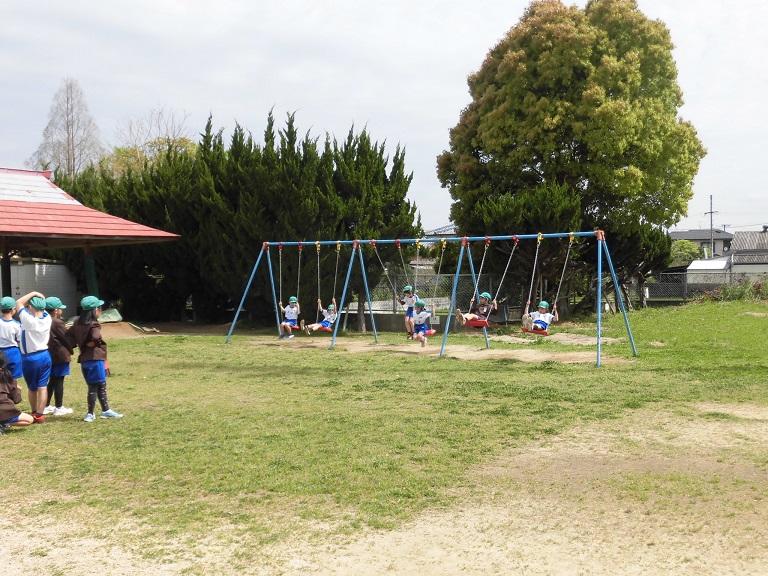 遊具の使い方を確認する2年生です。安全に使いましょう。
