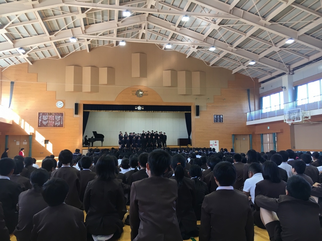 今日5時間目に、小中交流事業の一環として2・6年生が中学3年生の合唱コンクールのリハーサルの様子を見学に行きました。