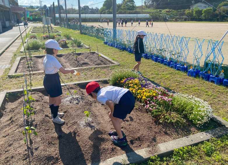 2年生が生活科の学習でいもの苗植えを行いました。八幡地区協議会の方々に協力していただきました。いもの他に花の苗も植えました。のばらハッピーガーデンが美しく明るい感じになりました。これから子どもたちと共に水かけなどのお世話や観察を頑張っていきます。
