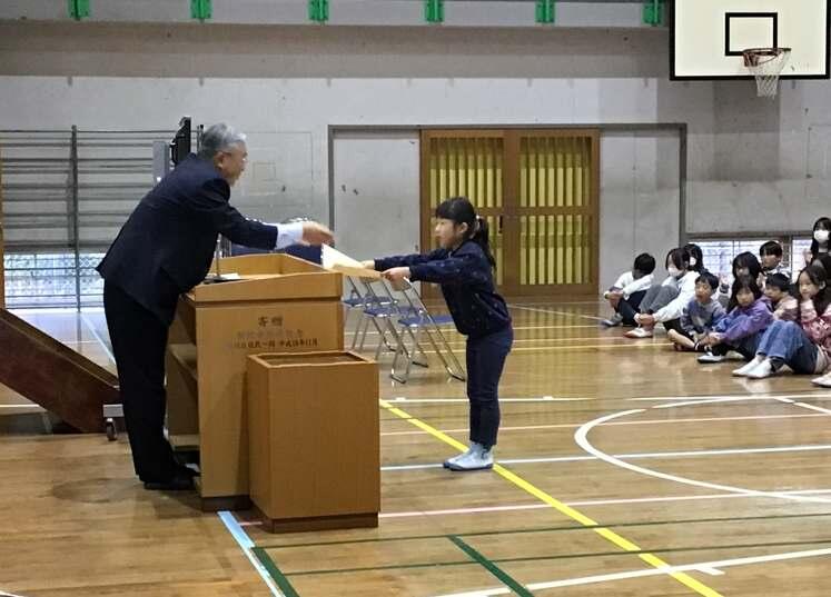 荒尾市の選挙管理委員会の方ゲストティーチャーとしてお招きし、選挙出前授業をしていただきました。模擬選挙に使われた投票用紙等の道具を実際の選挙で使われるものと同じでした。6年生もあと6年すれば18歳となり選挙権を持つことになります。全国的に選挙への関心の低さ(特に若者の投票率の低さ)が問題となっています。今のうちから選挙に関心を持ち、自分の一票が自分たちの未来の日本をつくるという意識を高めておくことが非常に大切だと思います。日頃から自分たちの市や町のよいところや課題に目を向けたり、新聞やニュースを見るようにしたりしていきたいですね。