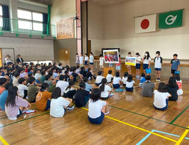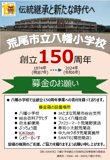 本校は今年度創立150周年という節目の年です。9月29日(日)に記念式典を計画しています。PTAや地域の方々には様々な面でご協力をいただいているところです。現在、在籍している子どもたちもこの式典に向けて何かできることはないかと考え、募金活動を行うことになりました。本日、代表の子どもたちが、メッセージ付き手作り募金箱を持って校区内の各所を訪問し、募金箱設置のお願いを行いました。快く、ご了承いただいたことに感謝申し上げます。ご協力いただいた募金は、記念品の購入等に使わせていただきます。