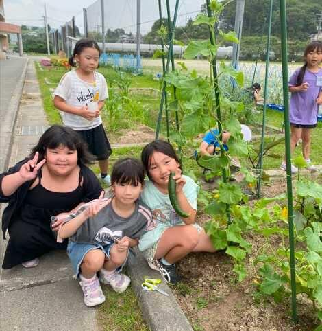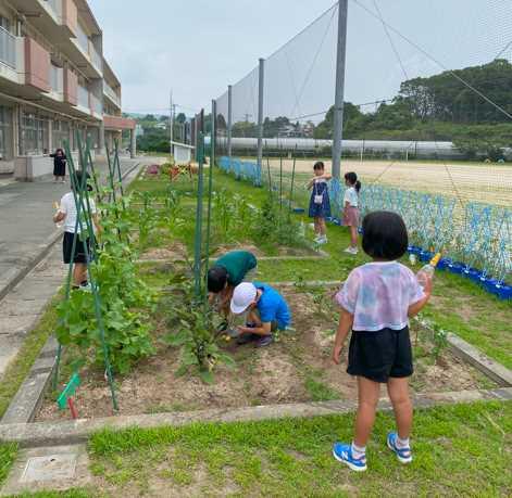 2年生が毎朝、野菜や花、さつまいもの水かけをがんばっています。今朝は大きなきゅうりが実っているのを発見し、大喜びで収穫する様子がありました。毎日、「今日はどれぐらい生長したかな?」と野菜畑に足を運ぶことを楽しみしているようです。
